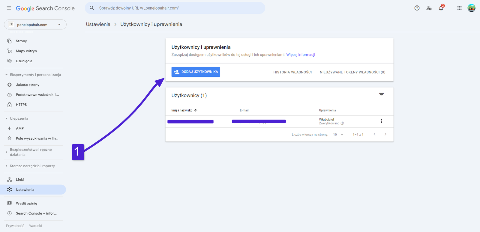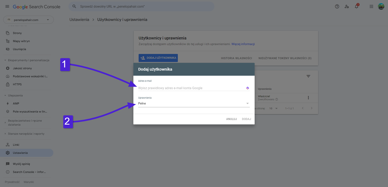 5. Kolejno dodaj dostęp do Google Search Console dla nowego użytkownika