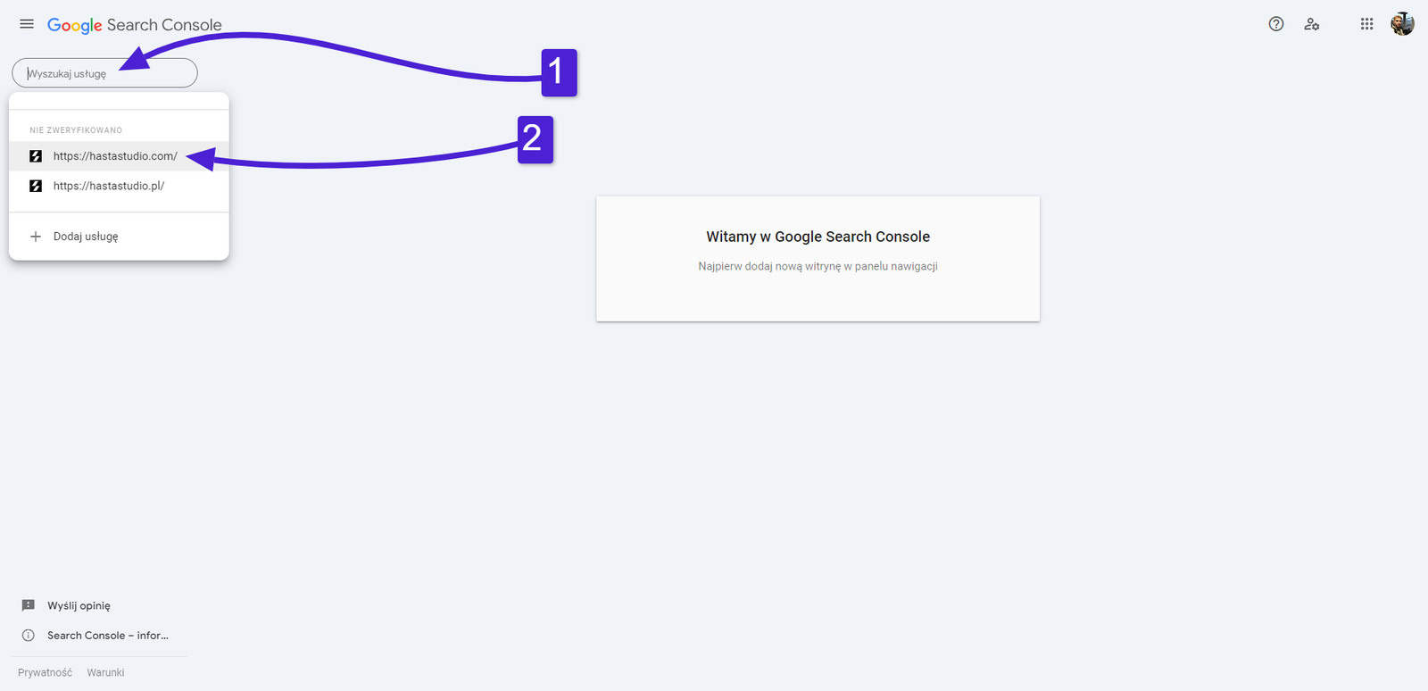 2. Gdy jesteśmy już zalogowani wyświetli nam się panel GOOGLE SEARCH CONSOLE